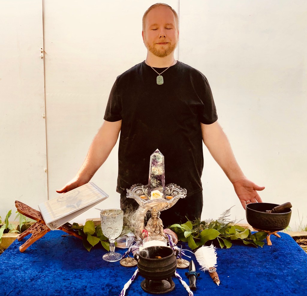 He will use a ceremonial tool, (Athame) to remove all negative unwanted energy from your aura and chakras.